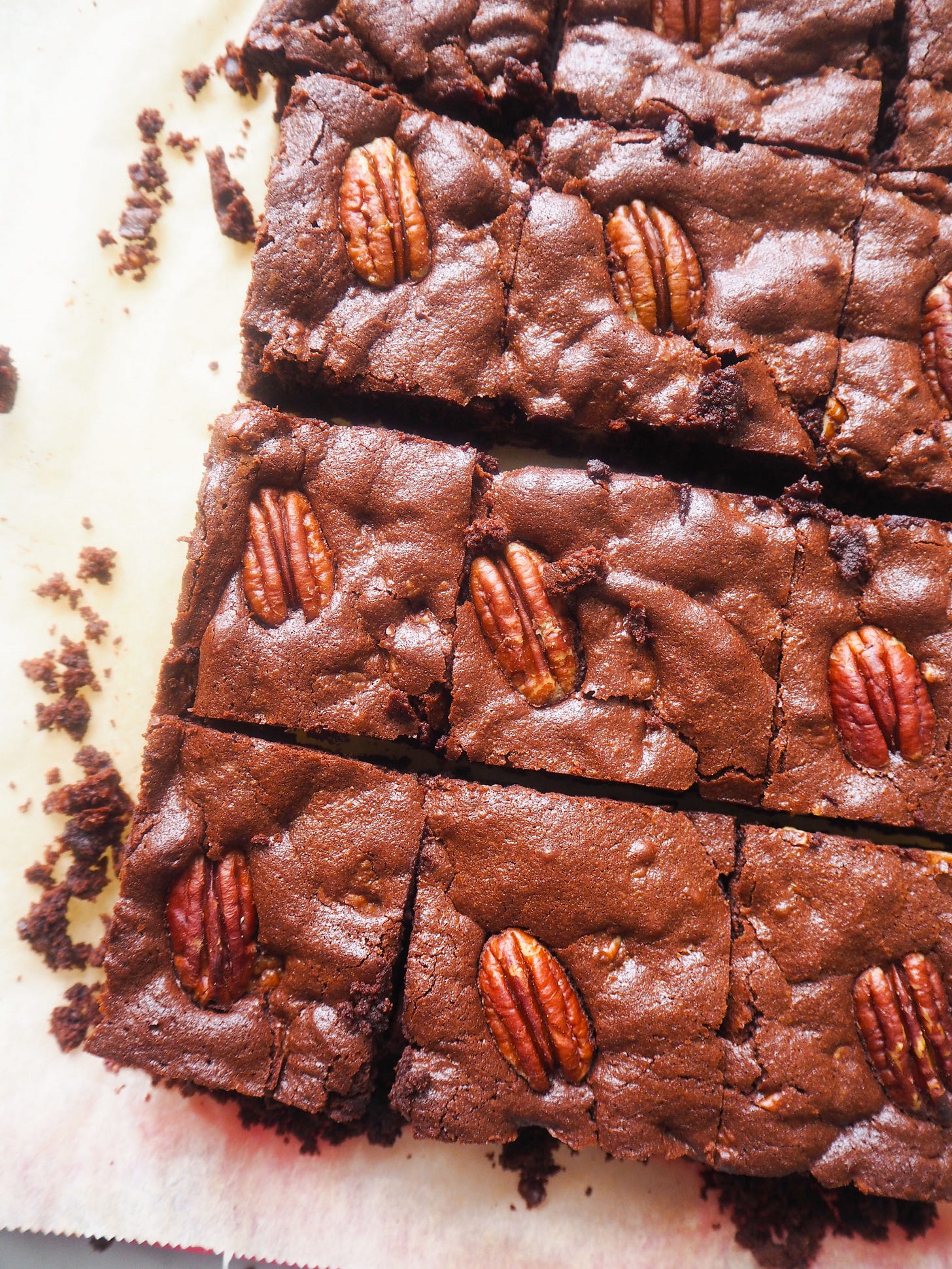 I am starting strong with my husband William’s favourite chocolate brownie recipe, he deserves a mention here for being endlessly supportive, kind and encouraging. The original recipe my mother has written out includes a chocolate butter frosting, but she has crossed this out as she obviously thought the brownies were so good that they didn’t need it. On this we agree. I know not everyone likes nuts in brownies but my mother was vehement about the necessity of pecans in a good chocolate brownie.