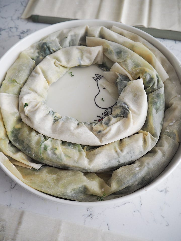 Take the dish for making your pie and brush with olive oil. Then take a first sheet of filo pastry and brush with olive oil, add a heaped spoon of the filling and spread it along the length of the filo sheet in one long line, rolling the filo pastry to encase the filling in a long cigar shape. Place in your pie dish and repeat. Each roll of filled pastry meeting the last and coming inwards to create a circular shape. You can pack the dish as tightly as possible. Once complete brush the top with a little more olive oil and scatter with a few pinches of sea salt.