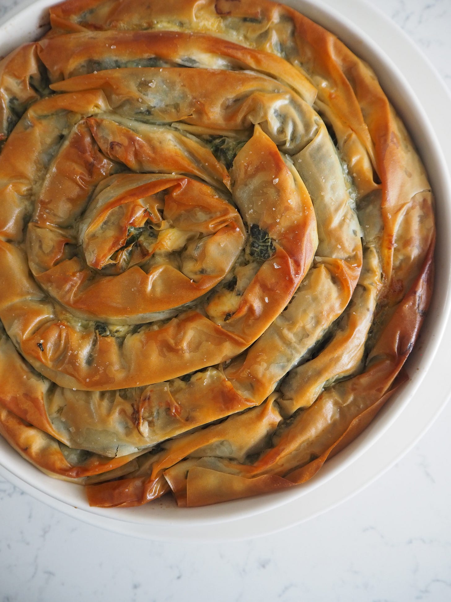 Spinach pie appears in many forms and cultures, across Europe and the Middle East, it is simple, comforting and endlessly adaptable. Here I am sharing my version of a spinach pie with feta cheese and dill wrapped in crisp filo pastry. I found this method of shaping the filling into rolls, then coiling them into a circular spiral to form the pie. Not only does it create the perfect ratio of filling to pastry, it is easy to assemble and looks impressive too. I would recommend serving the spinach pie warm with a tomato salad and some hard boiled eggs. It also makes wonderful leftovers for lunch the following day.