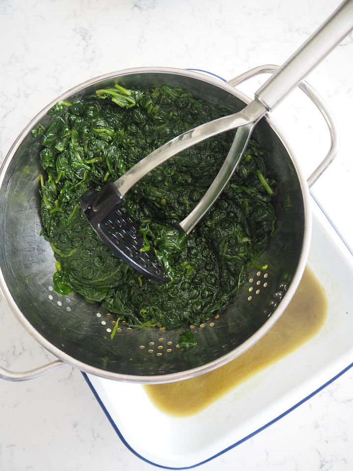 Prep the spinach, in batches sauté the spinach in a little olive oil until wilted. Remove the spinach to a sieve set over a deep tray, to help drain excess liquid. Repeat until all the spinach has been sautéed and wilted down. Once all the spinach is cooked press out any remaining liquid, you want the spinach to be dense with as little water as possible.